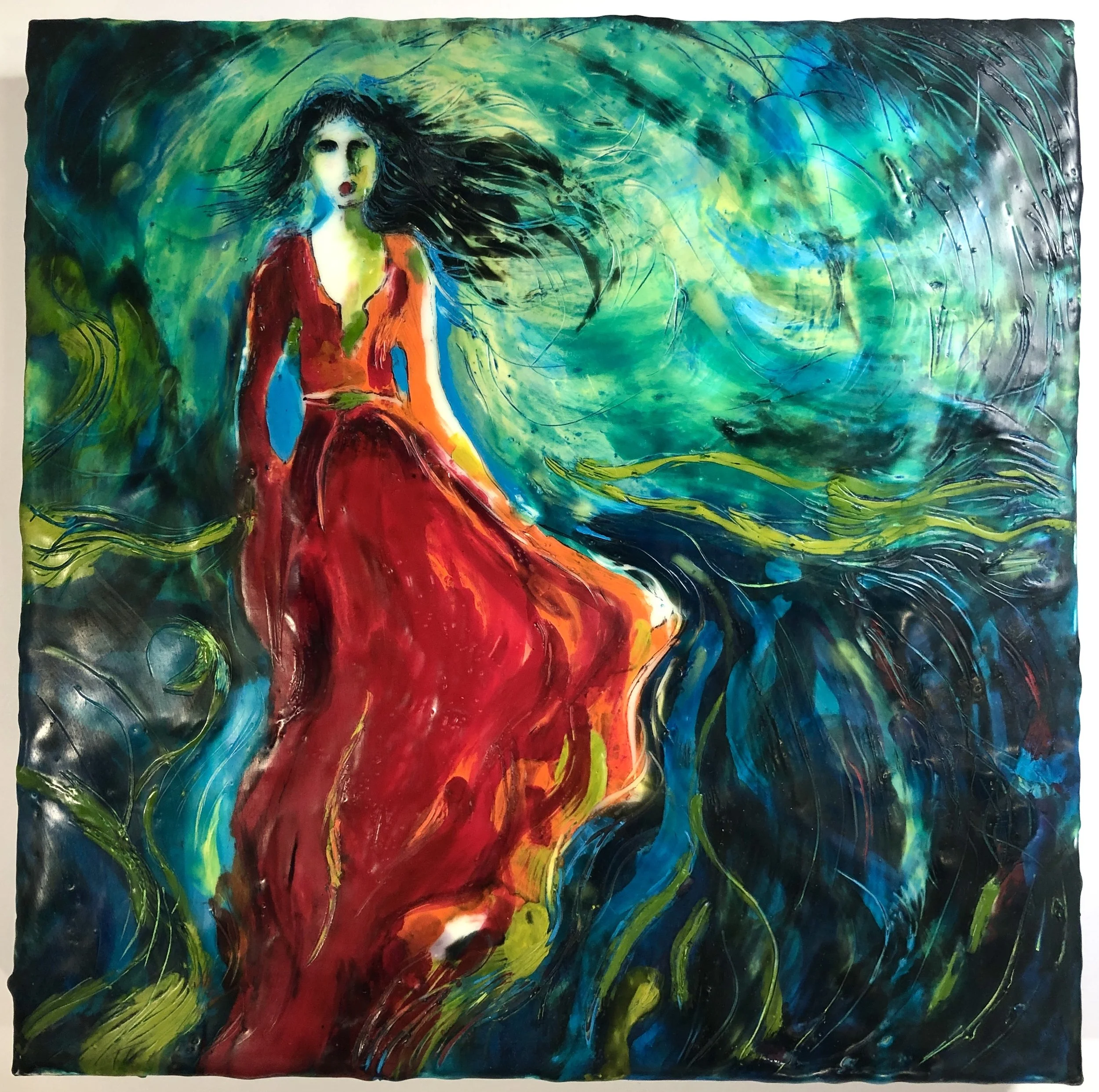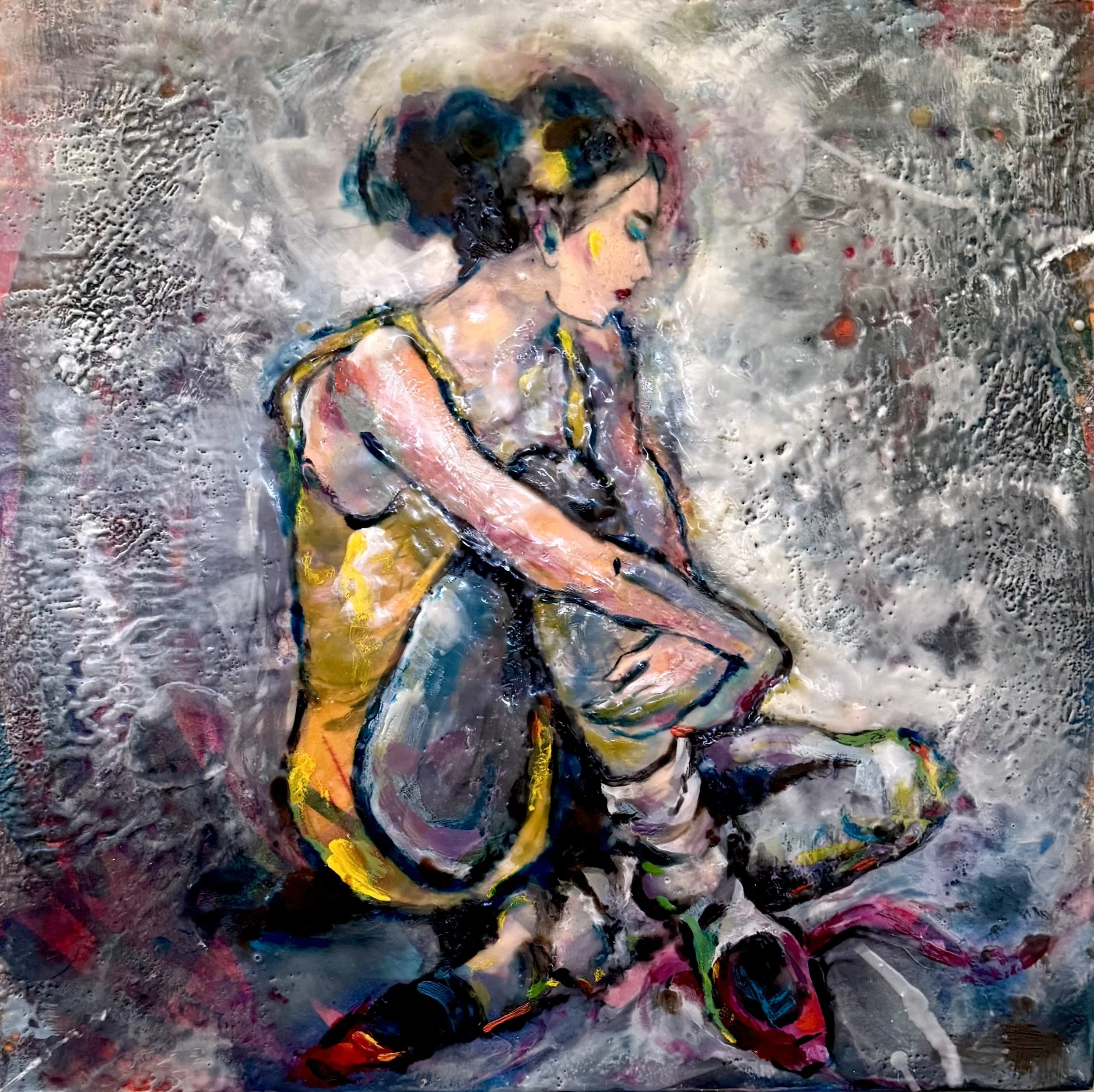 HER YELLOW LEOTARD, encaustic on cradled board, 16” x 16”. Best In Show Award, 2026