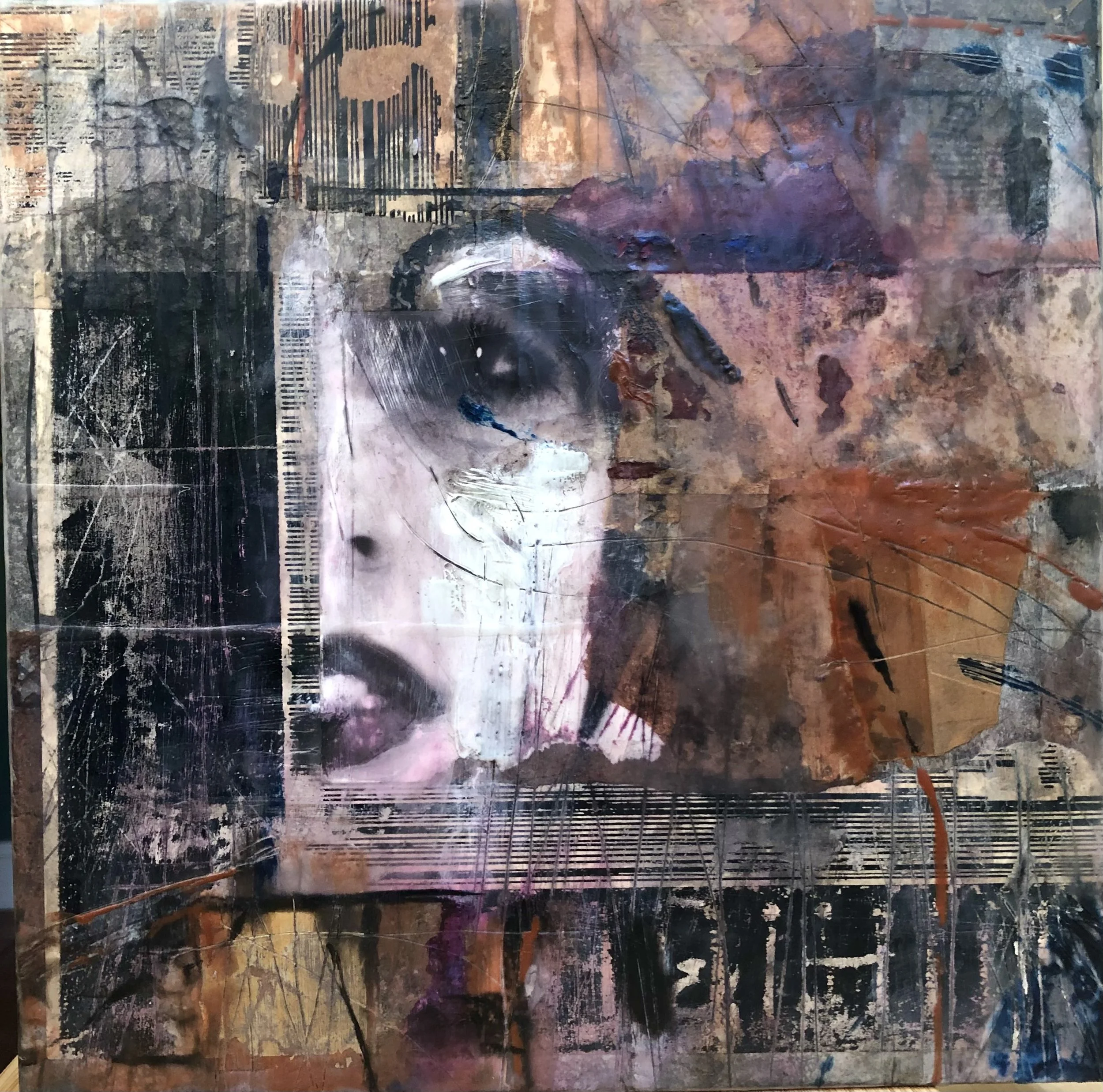 A variation on encaustic includes working with collage images. I started with a gessoed cradled board and applied several layers of tissue, scrap paper and personal images. After applying several layers of clear wax, I dug into the surface and rubbed india ink into the engraved texture.